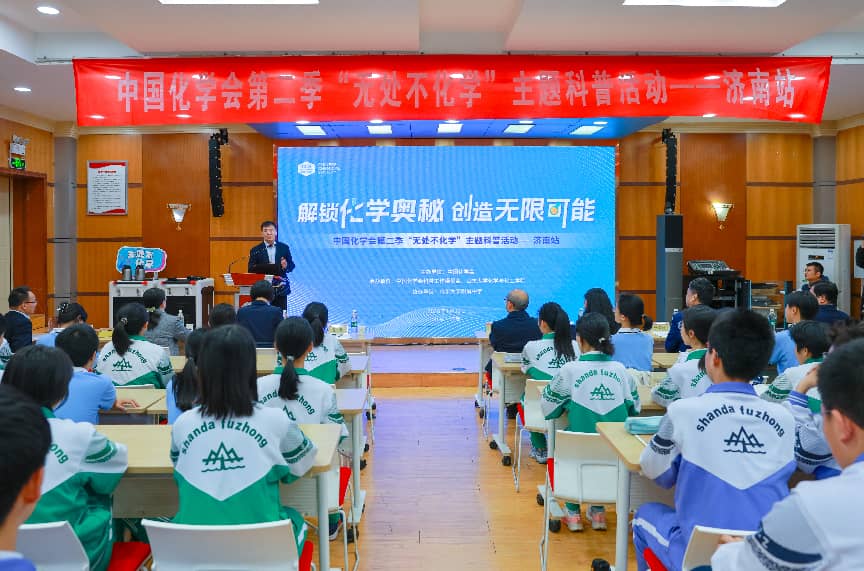 2026年4月20日,中国化学会“化学大家谈”系列科普报告第十九讲在山东省济南市山东大学附属中学顺利开讲。本次“化学大家谈”科普报告由中国科学院院士、中国化学学会副理事长、中国化学会科普工作委员会主任、中国科学院上海有机化学研究所唐勇研究员主讲,此次报告采用线上线下相结合的方式,来自山东大学附属中学的1900余名中学生参加了此次活动。