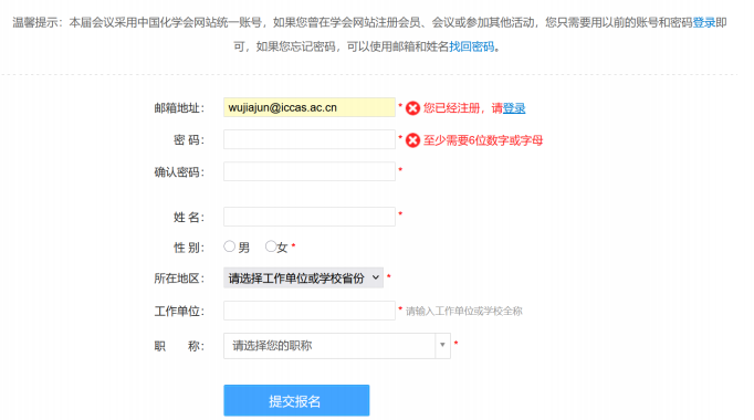 如果系统检测到邮箱地址已经存在账号,则会引导用户进行登录,登录后会有针对已有用户的注册报名界面。