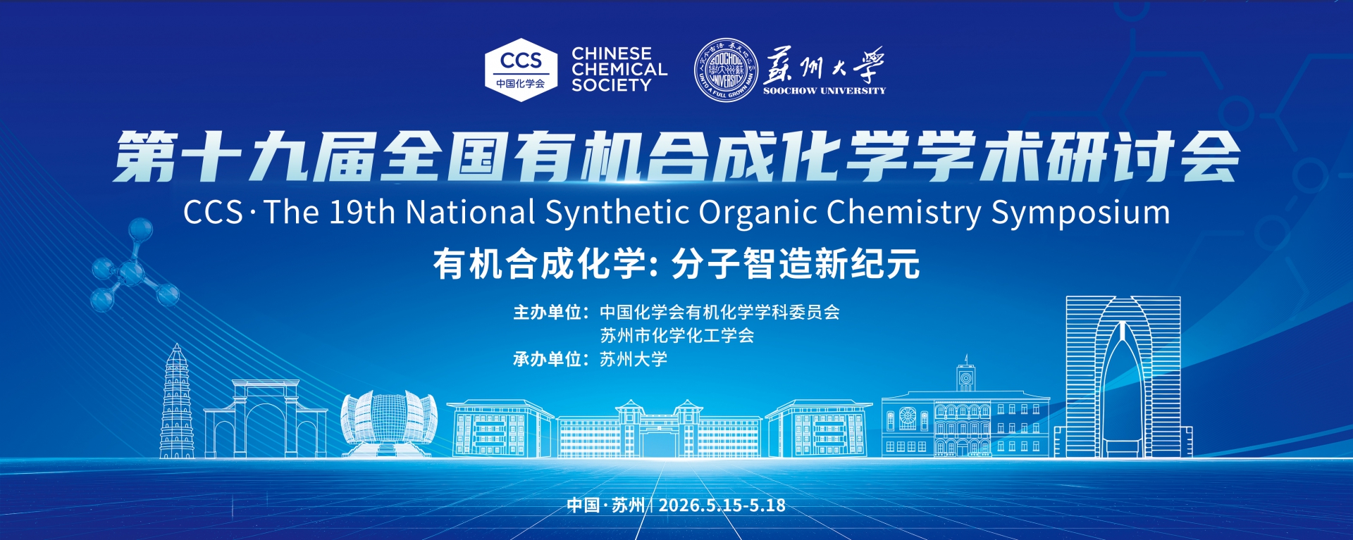 中国化学会第十九届全国有机合成化学学术研讨会定于2026年5月15日至18日在江苏省苏州市举行。